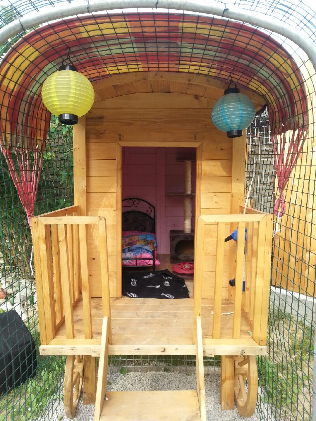 Des roulottes avec jardins, ombragées l'été et chauffées l'hiver, vous sont aussi proposées pour un ou deux chats de la même famille.